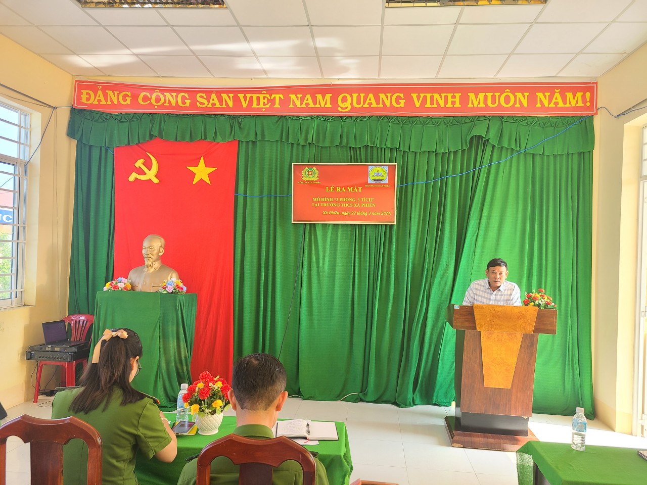 Dự lễ ra mắt mô hình về phía lãnh đạo Phòng Giáo dục có: Thầy Đặng Thanh Ty - Phó Trưởng phòng và Đào tạo, Thượng úy Thị Hồng Thoa - cán bộ đội tổng hợp huyện Long Mỹ; Đại diện chính quyền địa phương có: Ông Phan Hoàng Minh - Ủy viên BCH xã Xà Phiên, BGH, giáo viên, CNVC trường THCS Xà Phiên;